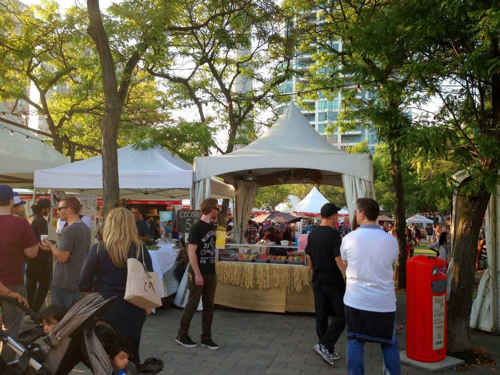 Event attendees hanging out on the lawn in front of the stage, and checking out the different booths outside the Harbourfront Centre.